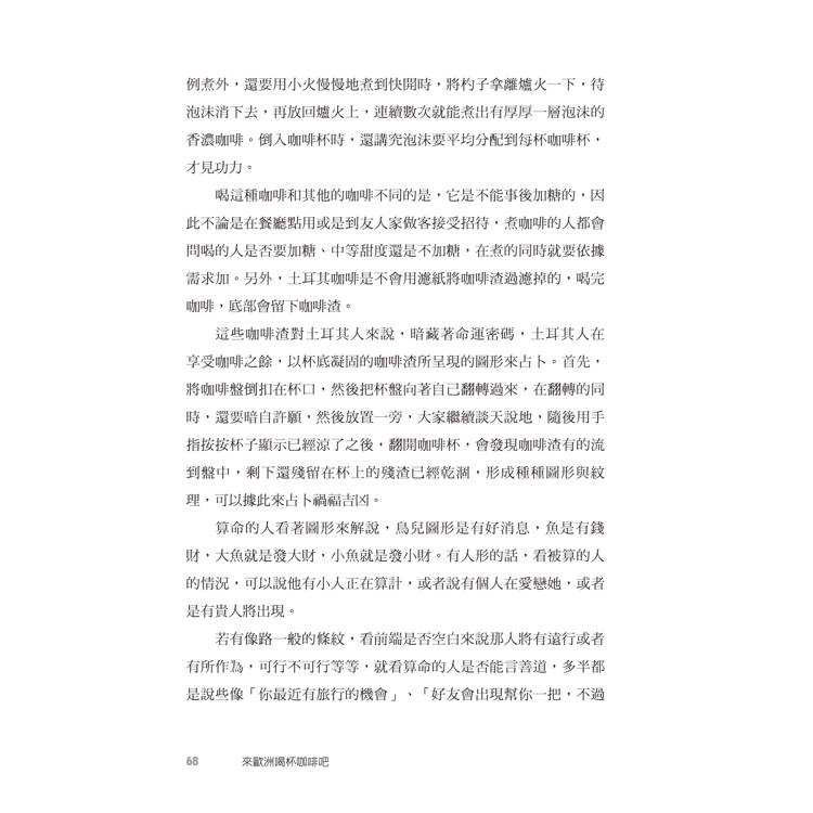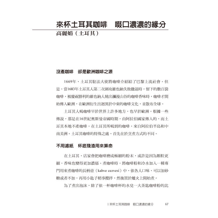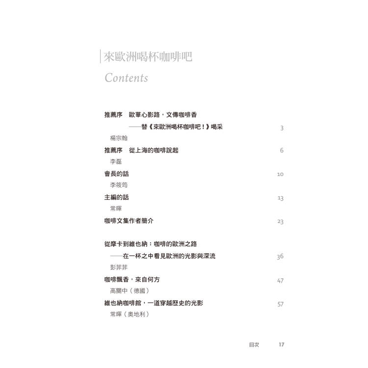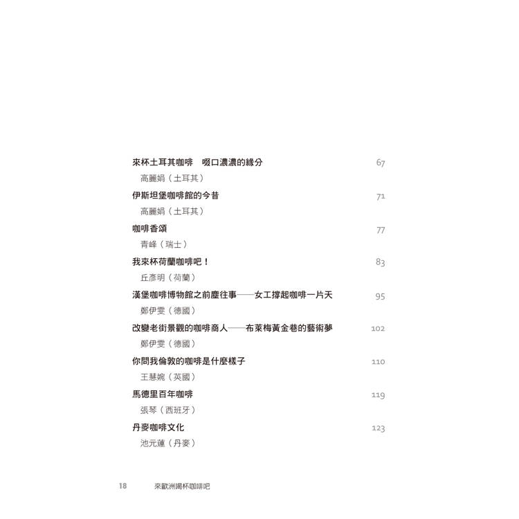 如今,當初的一個發想即將化為一本書。我誠摯地邀請您,隨著我們作者群的文字,走入這本書所編織的咖啡世界─來歐洲,喝杯咖啡吧!