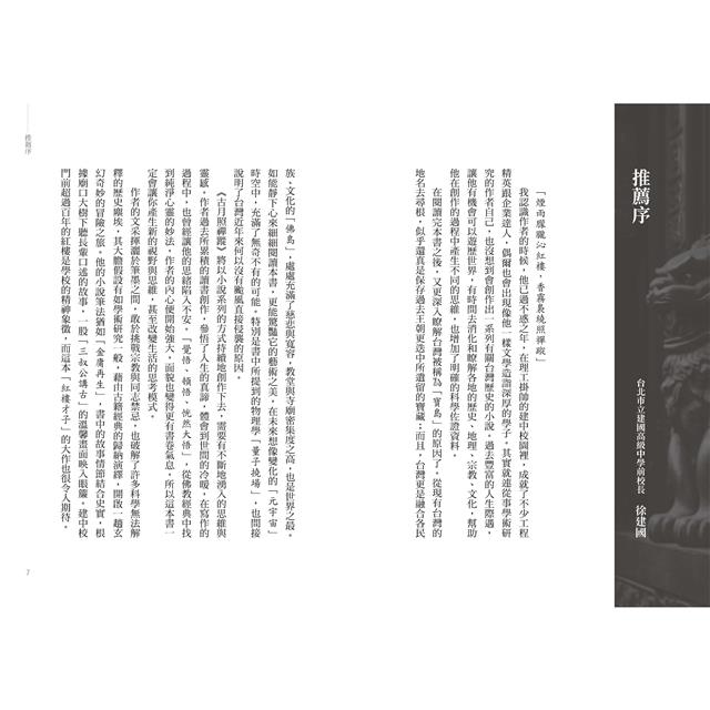 我認識作者的時候,他已過不惑之年,在理工掛帥的建中校園裡,成就了不少工程精英跟企業達人,偶爾也會出現像他一樣文學造詣深厚的學子。其實就連從事學術研究的作者自己,也沒想到會創作出一系列有關台灣歷史的小說。過去豐富的人生際遇,讓他有機會可以遊歷世界,有時間去消化和瞭解各地的歷史、地理、宗教、文化,幫助他在創作的過程中產生不同的思維,也增加了明確的科學佐證資料。