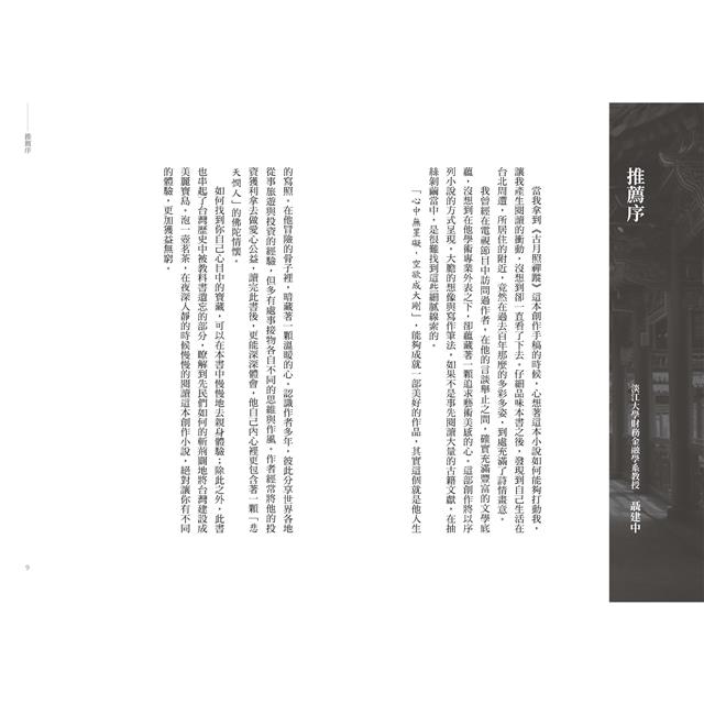 我曾經在電視節目中訪問過作者,在他的言談舉止之間,確實充滿豐富的文學底蘊,沒想到在他學術專業外表之下,卻蘊藏著一顆追求藝術美感的心。這部創作將以序列小說的方式呈現,大膽的想像與寫作筆法,如果不是事先閱讀大量的古籍文獻,在抽絲剝繭當中,是很難找到這些細膩線索的。
