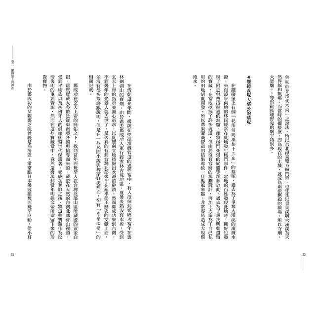 如何找到你自己心目中的寶藏,可以在本書中慢慢地去親身體驗;除此之外,此書也串起了台灣歷史中被教科書遺忘的部分,瞭解到先民們如何的斬荊闢地將台灣建設成美麗寶島。泡一壺茗茶,在夜深人靜的時候慢慢的閱讀這本創作小說,絕對讓你有不同的體驗,更加獲益無窮。