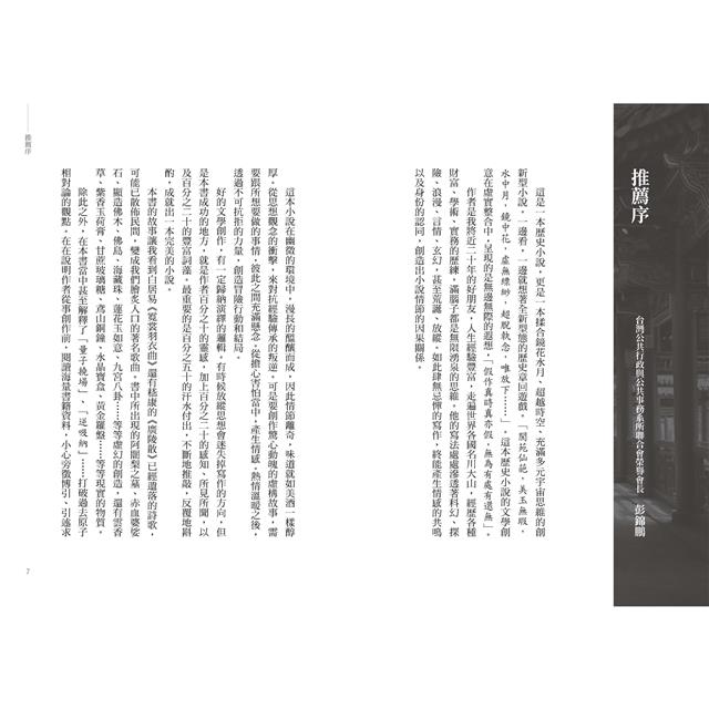 這是一本歷史小說,更是一本揉合鏡花水月、超越時空、充滿多元宇宙思維的創新型小說。一邊看,一邊就想著全新型態的歷史章回遊戲。「閬苑仙葩,美玉無瑕,水中月,鏡中花,虛無縹緲,超脫執念,唯放下……」。這本歷史小說的文學創意在虛實整合中,呈現的是無邊無際的遐想,「假作真時真亦假,無為有處有還無」。