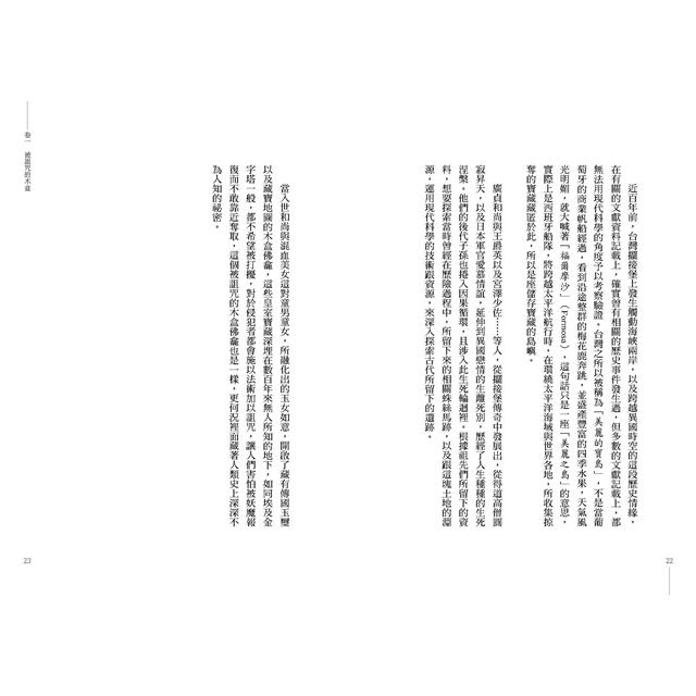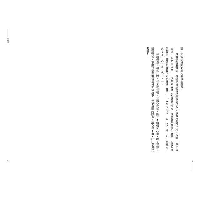台灣是美麗寶島,但過去曾經是海盜聚集以及外國勢力的殖民地。所謂「盛世藏古董,亂世買黃金」,按照過去古王朝更替的推演,也應蘊藏豐富的寶藏。本書故事的後面,都會用佛經來追求圓滿,佛云:「人生有八苦,生、老、病、死、愛離別,怨長久,求不得,放不下」。