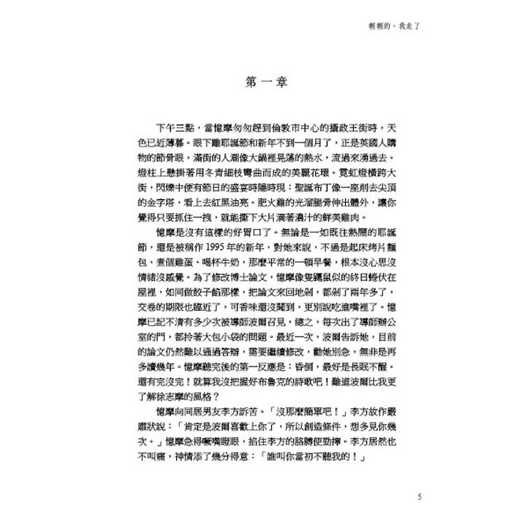 憶摩是沒有這樣的好胃口了。無論是一如既往熱鬧的耶誕節,還是被稱作1995年的新年,對她來說,不過是起床烤片麵包、煮個雞蛋、喝杯牛奶,那麼平常的一頓早餐,根本沒心思沒情緒沒感覺。為了修改博士論文,憶摩像隻鼴鼠似的終日蜷伏在屋裡,如同做餃子餡那樣,把論文來回地剁,都剁了兩年多了,交卷的期限也臨近了,可香味還沒聞到,更別說吃進嘴裡了。憶摩已記不清有多少次被導師波爾召見,總之,每次出了導師辦公室的門,都拎著大包小袋的問題。最近一次,波爾勸她別急:到時候就算論文沒通過,也不要緊,無非是再多讀幾年。憶摩聽完後的第一反應是:昏倒,最好是長眠不醒。還有完沒完!就算我沒把握好布魯克的詩歌吧!難道波爾比我更瞭解徐志摩的風格?