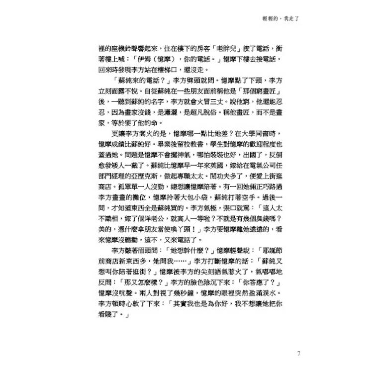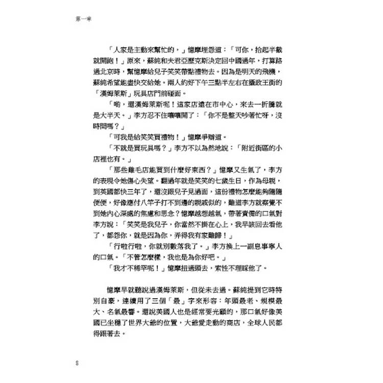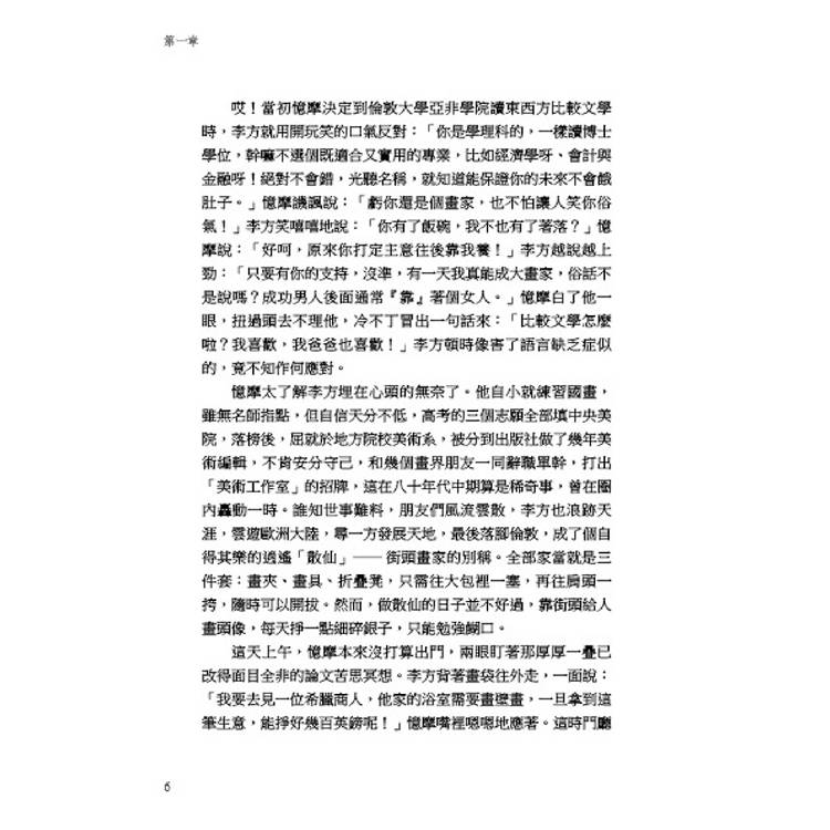 哎!當初憶摩決定到倫敦大學亞非學院讀東西方比較文學時,李方就用開玩笑的口氣反對:「你是學理科的,一樣讀博士學位,幹嘛不選個既適合又實用的專業,比如經濟學呀、會計與金融呀!絕對不會錯,光聽名稱,就知道能保證你的未來不會餓肚子。」憶摩譏諷說:「虧你還是個畫家,也不怕讓人笑你俗氣!」李方笑嘻嘻地說:「你有了飯碗,我不也有了著落?」憶摩說:「好呵,原來你打定主意往後靠我養!」李方越說越上勁:「只要有你的支持,沒準,有一天我真能成大畫家,俗話不是說嗎?成功男人後面通常『靠』著個女人。」憶摩白了他一眼,扭過頭去不理他,冷不丁冒出一句話來:「比較文學怎麼啦?我喜歡,我爸爸也喜歡!」李方頓時像害了語言缺乏症似的,竟不知作何應對。