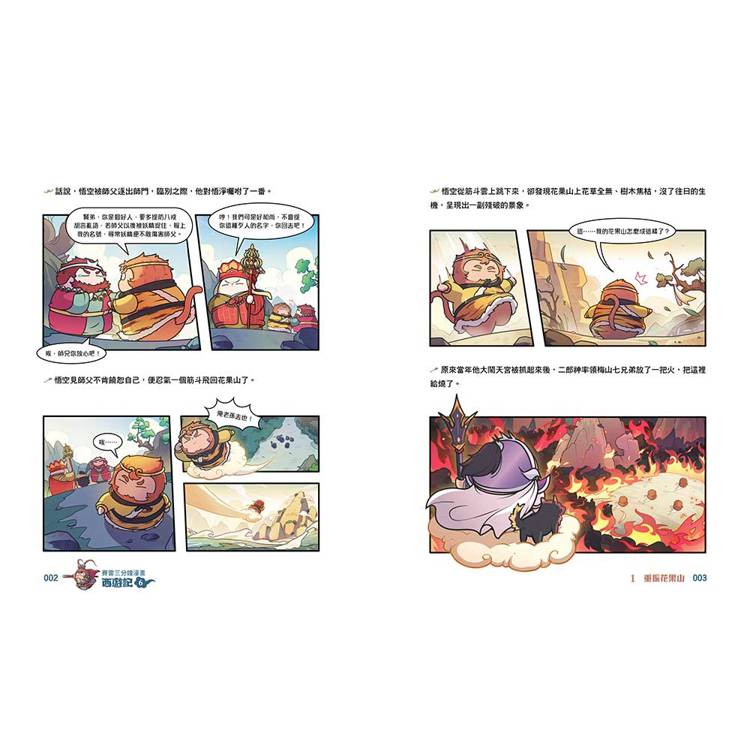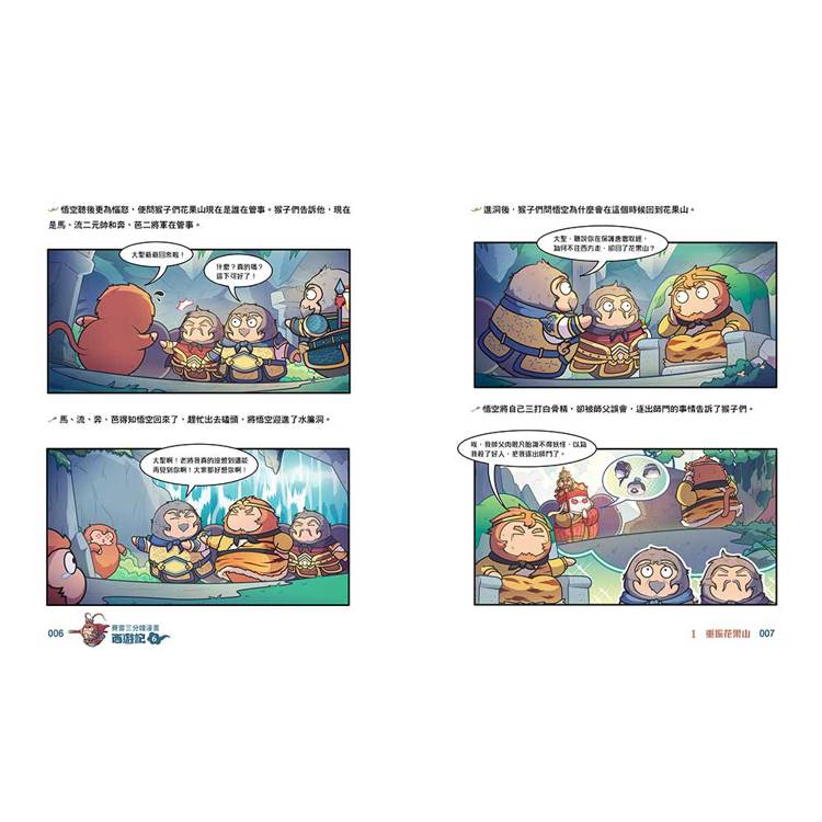 本集從「重振花果山」展開,孫悟空再現齊天大聖的氣勢,接著故事推進到驚險的「勇鬥黃袍怪」。師徒誤入「寶象國」,引發「寶象國認親」、「白龍鬥黃袍」等經典情節,全彩漫畫搭配爆笑吐槽與知識彩蛋,讓讀者在歡笑中輕鬆認識《西遊記》。