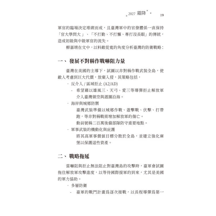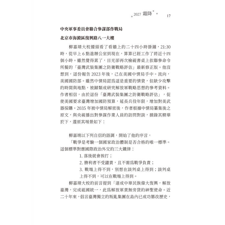 本書回顧了2027年秋季發生於臺灣島上的一場戰爭。這場衝突,在中國被稱為「解放臺灣」,而在臺灣則被視為「保衛家園」或「自衛獨立」的行動。儘管國際社會早已預見此一事件的可能性,但其確切爆發時間始終難以預測。當中國人民解放軍正式對臺灣展開軍事行動的消息傳出時,全球各界無不意識到,這是一次具有分水嶺意義的歷史轉折,標誌著一個我們所熟知的世界秩序已不可逆地改變。