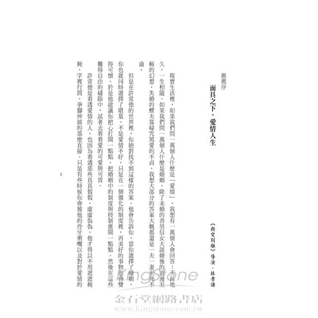 在愛情裡頭,我們不也是都戴上了面具,拿著社會給的劇本,一句句朗讀著「我愛你,而你也應該愛我」的台詞。許常德的觀點或許尖銳,但是至少他告訴你,面具之下,愛情人生,你可以有不一樣的選擇。