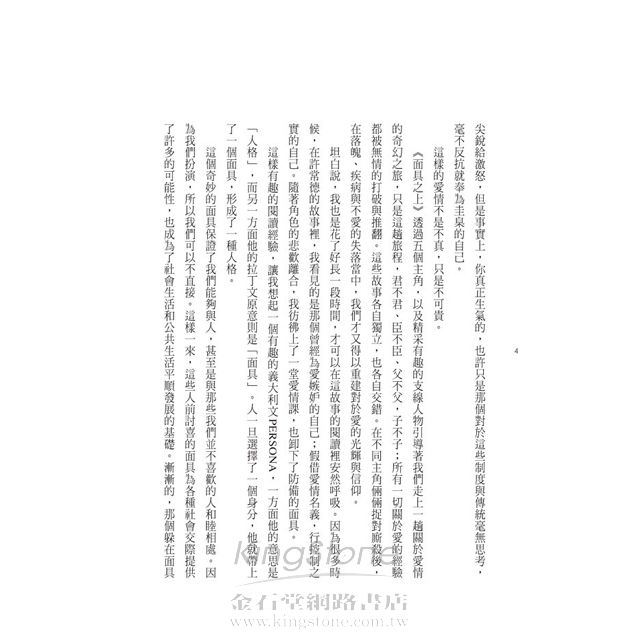 這樣有趣的閱讀經驗,讓我想起一個有趣的義大利文PERSONA,一方面他的意思是「人格」,而另一方面他的拉丁文原意則是「面具」。人一旦選擇了一個身分,他就帶上了一個面具,形成了一種人格。