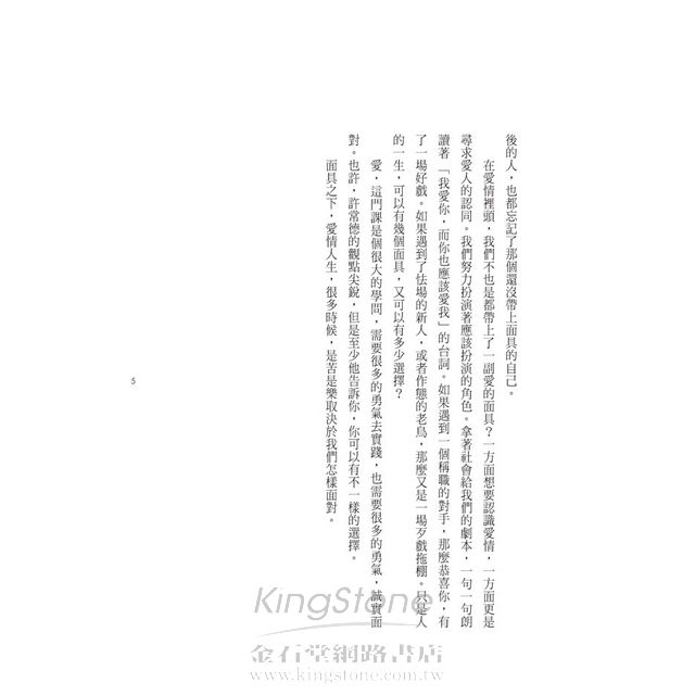 在愛情裡頭,我們不也是都帶上了一副愛的面具?一方面想要認識愛情,一方面更是尋求愛人的認同。我們努力扮演的應該扮演的角色。拿著社會給我們的劇本,一句一句朗讀著 「我愛你,而你也應該愛我」的台詞。如果遇到一個稱職的對手,那麼恭喜你,有了一場好戲。如果遇到了怯場的新人,或者作態的老鳥,那麼又是一場歹戲拖棚。只是人的一生,可以有幾個面具,又可以有多少選擇?