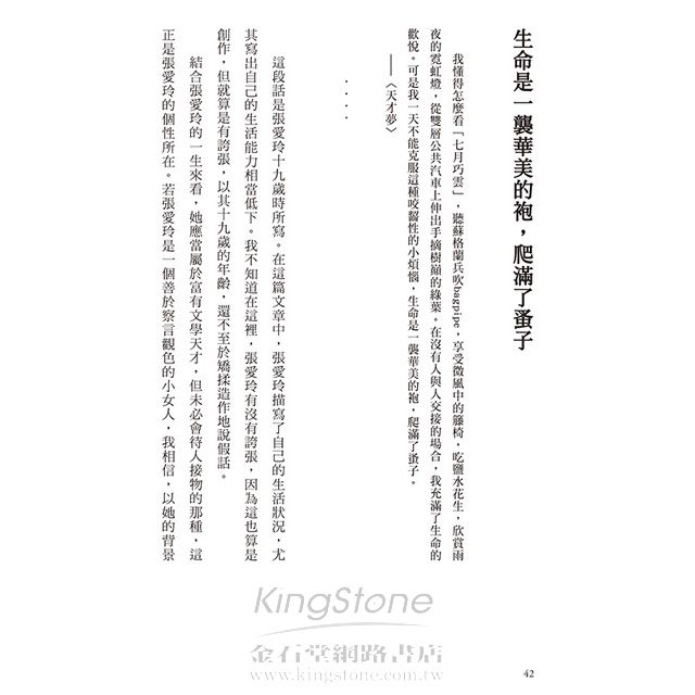 張愛玲說:生命是一襲華美的袍,爬滿了蚤子。這是最典型的張氏生命觀與敘事法。說是生命觀,張愛玲肯定人生,即使是處於痛苦與破壞中的人生,張愛玲也是肯定的。所以,生命的景觀是華美的,美得就像一襲華美的袍。但人生又不可能完滿,這樣與那樣的煩惱纏繞著人,像那小小的蚤子一樣,藏在這裡與那裡,無法撇清,為生命填添了幾分灰暗、煩惱、怨氣等等。這句話同時也建構了張氏的敘事法,先肯定後否定,即她所說的「反高潮」,在看似高潮到來時,猛然降下,有了意外的藝術效果。當我們看到「生命是一襲華美的袍」時,我們興奮了。我們看看自己,再看看別人,走在春天的原野裡,走在燈火通明的大街上,我們多麼幸福與驕傲啊。可別得意得太早。我們再看到「上面爬滿了蚤子」,我們鼓起的興奮似乎一下子洩氣了。人生哪裡沒有煩惱?華美的袍子,也會讓爬滿的蚤子給弄個七孔八洞的。張愛玲的反高潮敘事,揭示了生命既美麗又充滿曲折的複雜性。