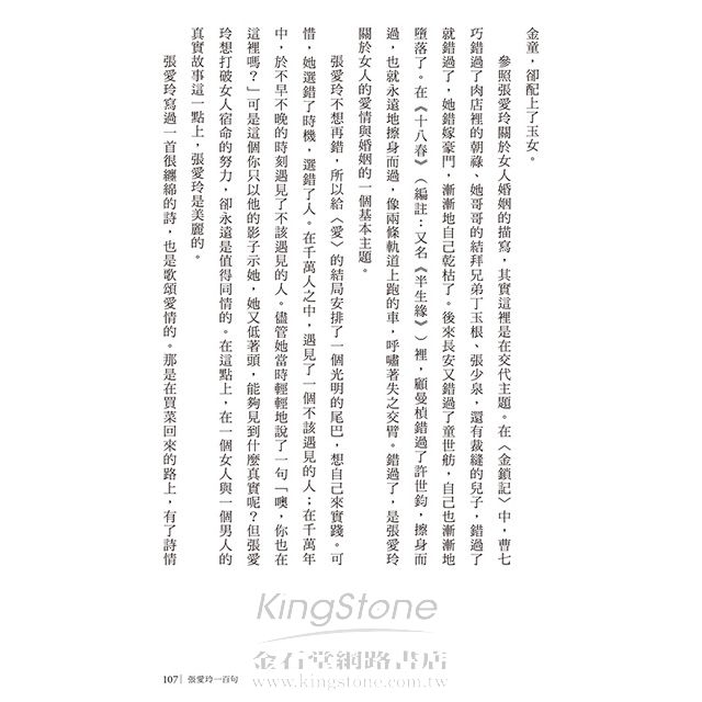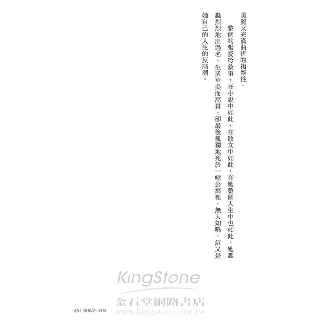 《張愛玲一百句》是以張愛玲的多條名句雋語所構成,從張氏典型語錄入手,加入解讀者的深入分析與旁徵博引,乃是研究張愛玲思想情感的精闢著作。《張愛玲一百句》揭示了張愛玲的思想境界與哲理思考,勾勒出一個由張氏理解所形成的精神尺度,由此為讀者提供一種思考人生的視角,每能發人深省。