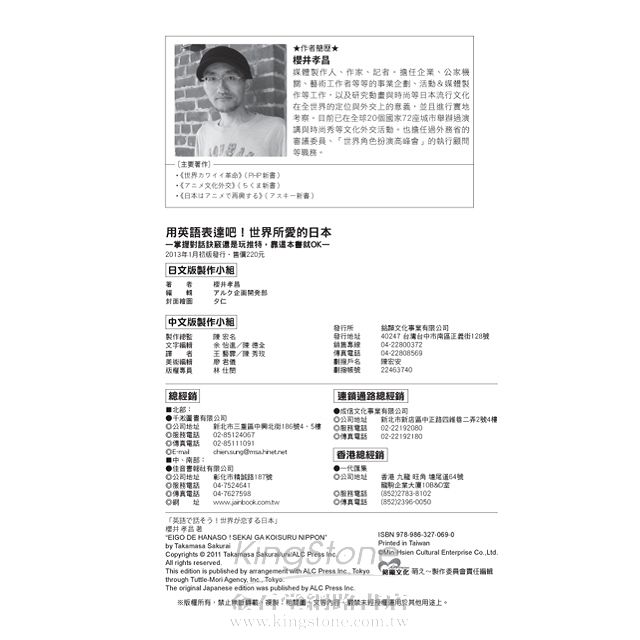 青少年認為海外與自己在精神上十分遙遠,並很可能將這種觀念歸咎於自身外語能力的不足。若想和海外人士在各種場合進行交流,外語能力固然重要。但,連繫人與人之間的橋梁並非全憑外語能力吧。對照自身經驗,作者確信溝通絕非只靠外語能力。在語言教育方面,自認為是個完全無用廢材的他。強調,若問「是否缺乏外語能力便無法和海外青少年深入溝通」,作者的答案是否定的。因為提倡透過動畫及原宿時尚等日本的流行文化進行文化外交,並且加以實踐,推行此文化外交而遊歷過20多個國家、72座城市,這個數目多少也能證實上述的說法,現在,作者將自身的經驗及心得集結成《用英語表達吧!世界所愛的日本》一書,並以50個日本發源關鍵字來指導對外語學習覺得苦手的讀者,今後無論是掌握對話訣竅還是玩社群網誌,靠本書就OK囉!