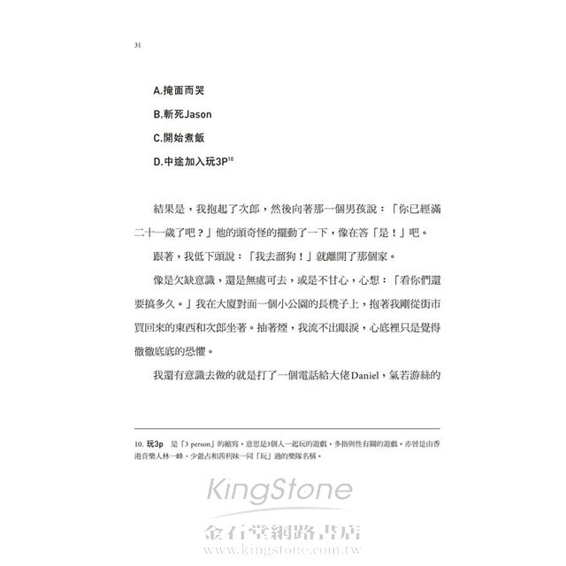 記得那天,正刮著颱風,潮濕的味道,過冷的空調,坐在kubrick那咖啡色的環境中,看著邵先生那瞪得杏圓的眼睛認真地講解。我了解到「基本書坊」的 小本運作模式,又同時,亦感到這小出版社的信念與誠意。我知道,《突然獨身》真要做華語版,我要的就是這樣一個剛起步,大家可以並肩一起走的出版社。