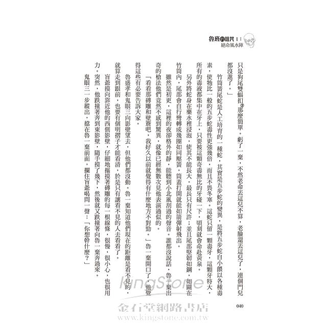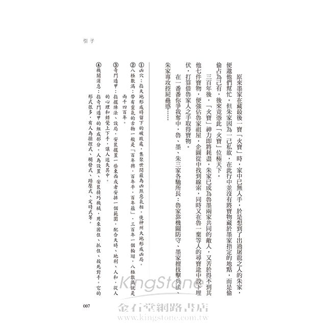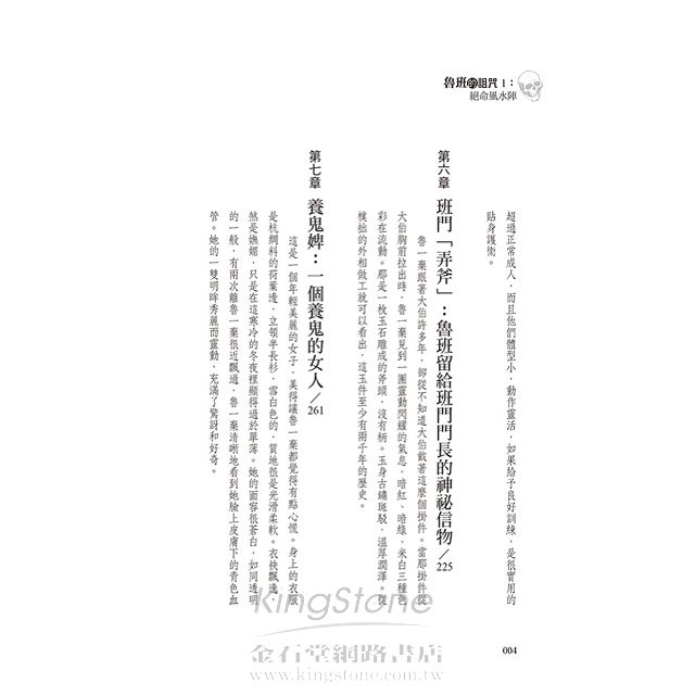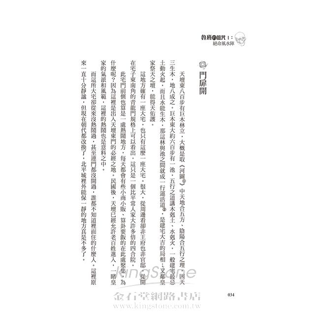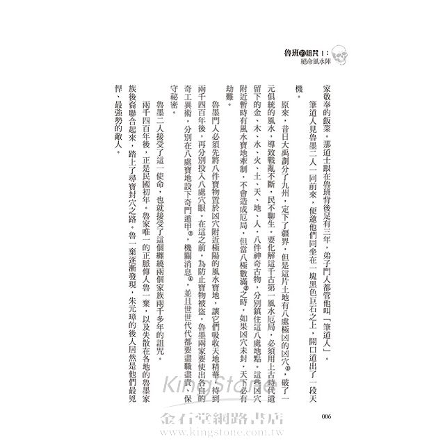 昔日大禹劃分九州之後,卻發現有八處極凶的凶穴,破了一元俱統的風水。欲化解這千古第一風水厄局,須用八件上古寶物分別鎮住。西元前448年,魯班與墨子接下了封穴任務。兩千四百年後,八極之數已滿,正是民國初年,魯家傳人魯一棄背負家族的使命,踏上了尋寶封穴之路。只是,魯一棄沒想到,朱元璋的後人居然是他們最兇悍、最強勢的敵人……《魯班的詛咒》即將帶領讀者走進一個真正的「天羅地網」、無法逃脫之地。(文/龍時代主編廖淑鈴)