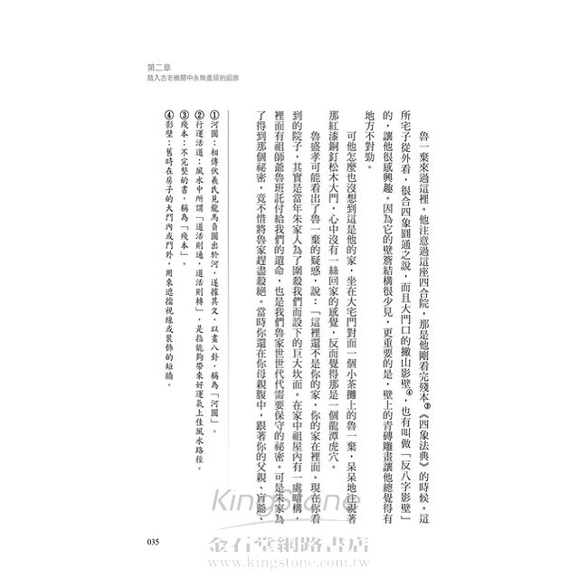 進入內宅院,他們沒見到東西廂房,這對魯一棄來說已經見怪不怪,這宅院裡什麼都不缺,就是缺房間。這內宅院中雖然沒廂房,倒是有一段抄手遊廊。怪就怪在這「一段」上,東牆上沒有,西牆上也只是靠正屋邊有一段,而且遊廊的寬度在靠正屋的地方最寬,愈往南愈窄,到西牆的中間處就窄成一個尖,沒有了。另外,與其他內宅院稍有不同的是,院中靠正屋有四棵不高的樹,樹上掛著巴掌大的東西,在隨風擺動,看樣子是沒掉光的樹葉。