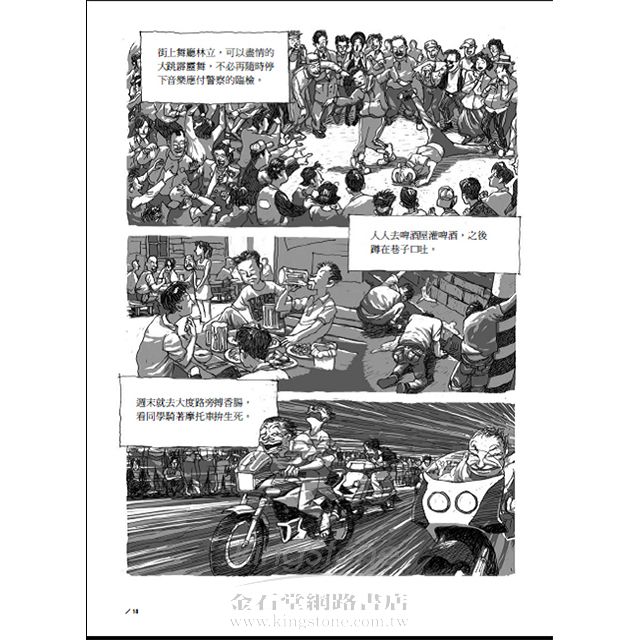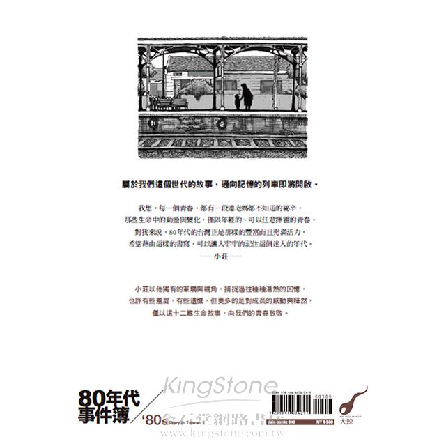 作者小莊1997年以《廣告人手記》創下十八刷紀錄,為台灣第一部圖像小說作品,本書是他2013年最新力作,書中以十二篇生命故事,向青春致敬。因為對他來說,80年代的台灣正是那樣的豐富而且充滿活力,希望藉由這樣的書寫,可以讓人牢牢的記住這個迷人的年代。包括:誰不迷戀李小龍?熱血沸騰地擺弄雙截棍喊「嘩喳」!大清早看黑白電視轉播的棒球賽,振臂高呼:中華隊轟不讓!五分頭的髮禁,耳上一公分的限制,一群慘淡少年涼颼颼的腦袋瓜……「願與有緣人相會?」穿上約定的T恤,忐忑等著筆友現身……帥!窄腳七分褲配志村白布鞋,鑽進地下舞廳尬霹靂舞。透過本書,讀者將重溫80年代的美好!