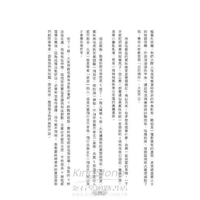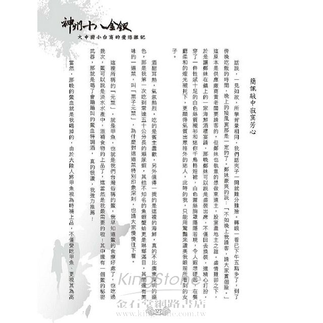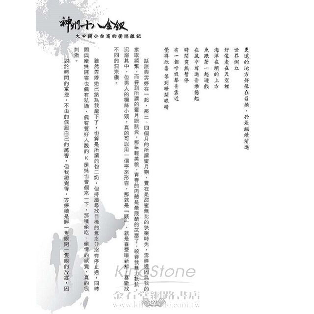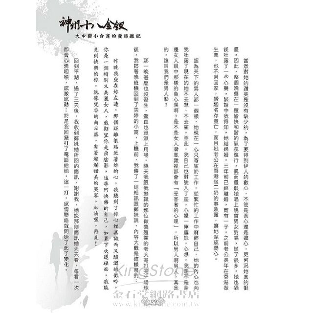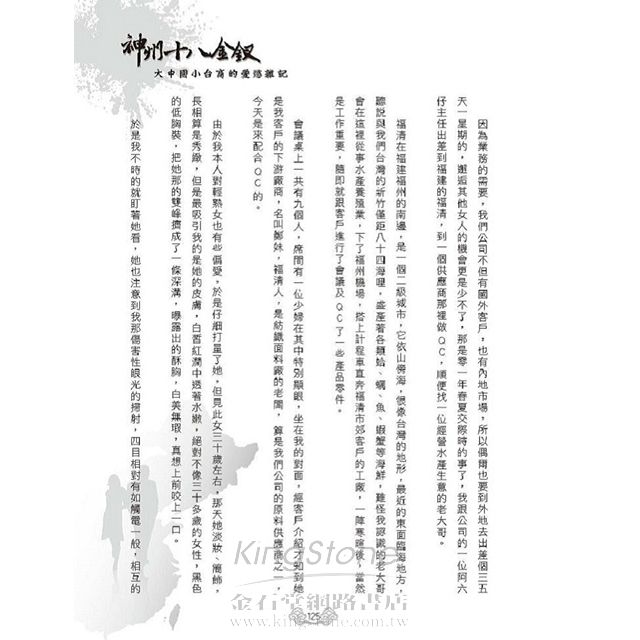 談起台商在大陸的生活,不得不提及台商或台幹與大陸本地人間的男女情愛關係。然而,人有思想,有文明,又絕不只是個為慾所縛的蠢物。因此,寫情慾故事,絕不應該只寫一陣亂突亂刺、男歡女愛,便妄想得到大家的認同。《神州十八金釵》一書,雖是淺薄之作,但都是我自身所遇或是周遭朋友所經歷的情愛故事。其實在寫這本書的時候,心中是有著無比的掙扎。為什麼大多數男人到了大陸就會想要亂來呢?基本上我認為這是一種人性。性是人的原慾,也是人類基本的需求之一,人和動物不一樣的地方就是因為我們會思考、會挑選,會動心。