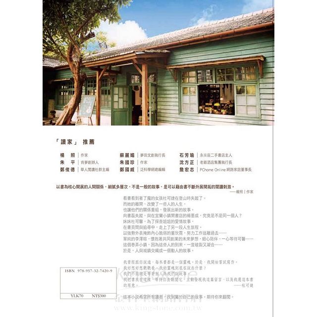 我們都玩過「故事接龍」的遊戲,當不同人接手故事時,就會開出不一樣的花朵,最後可能發展出的創意,往往讓我們驚呼連連。誠摯邀請讀者們進入烏奴奴與 夏佩爾為我們鋪陳的「巷弄裡的那家書店」,相信我,你會愛不釋手,一章接一章地往下閱讀。同時,除了感謝楊照、感謝遠流外,我還要特別感謝石芳瑜、朱平、 朱國珍、李全興、沈方正、邱明慧、封德屏、商台玉、張大春、陳郁敏、陳清河、曾國峰、黃巾倪、黃海鳴、黃麗燕、詹宏志、蔣顯斌、鄭俊德、鄭國威、謝榮雅、 羅智成這些好朋友(請原諒我用姓名筆畫順序這麼沒創意的方式來介紹你們),謝謝他們一路支持「巷弄裡的那家書店」,常常二話不說就協助提供資源。這個充滿 冒險精神的計畫,因為有這麼多人的鼓勵和協助,更顯得完整及珍貴。
