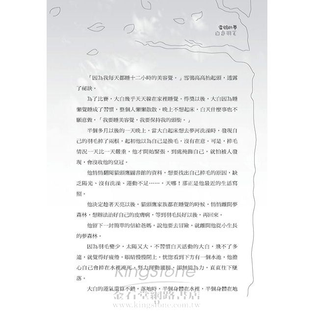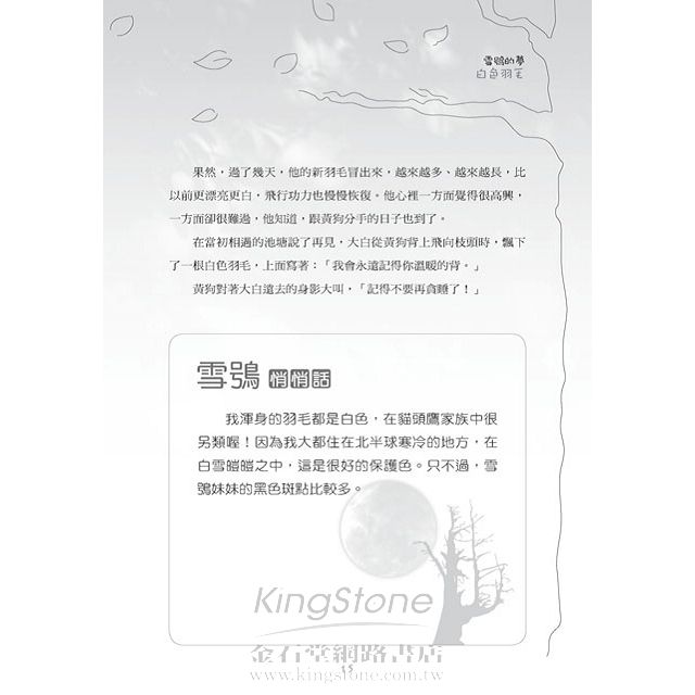 愛哭的眼鏡鴞、作白日夢的斑點鴞、瘋狂節食的領角鴞、喜歡搬家的褐鷹鴞、渴望變臉的鬼鴞……他們種類不同,羽毛顏色不同,生活習性更不同,但在這座森林裡,卻和平共處,沒有恐懼悲傷,只有快樂與祥和。這本書訴說的是他們精采動人又有趣的故事。