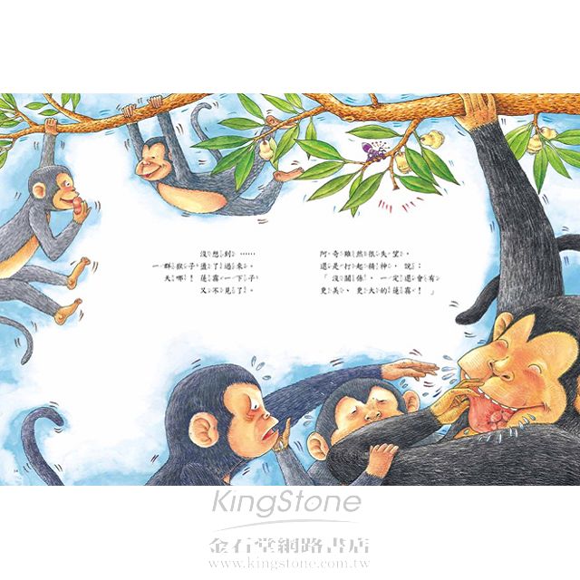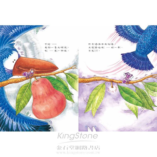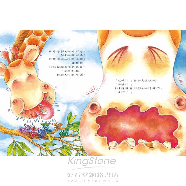 作者在「選角」時,也特意挑選了螞蟻與長頸鹿兩種體型反差極大的動物作為主角,讓許多有趣的畫面也隨之產生:前幾頁的畫面完全按照小螞蟻的視野放大周遭景物,強化圖畫的張力;之後阿奇為魯班拔出蓮霧籽的畫面也讓兩者間的對比更強。還有,為了轉移魯班對牙痛的注意力,阿奇和同伴們紛紛花樣百出,開始滾大球、疊羅漢等,這一頁也非常有趣呢!記得引導小朋友仔細看,小螞蟻們總共耍了幾種把戲呢?另外,在最後一頁,之前各自出現的配角們,全部都再次大集合了喔!讀到這一頁的時候,也別忘了帶著小朋友一起「點點名」喔!