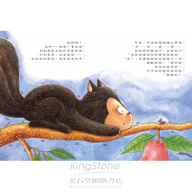 本書以「想找禮物送朋友」的單純想法為出發點,是小朋友們都能理解的生活體驗,很容易就能產生共鳴。作者讓阿奇找禮物的過程中波折不斷:精挑細選才找到的漂亮蓮霧,一下子被忽然俯衝而下的鳥兒叼走了、一下子又差點兒被松鼠吃掉……以許多轉折營造出高低起伏的情節,更是緊緊抓住了小朋友的注意力。另外,畫家很用心處理角色的臉部表情,無論是焦急、興奮、緊張等情緒都描繪得十分細膩。尤其是當阿奇好不容易再找到另一個蓮霧,卻又看到黑黝黝的洞裡有一雙大眼睛企盼地望著自己的那一幕,在小與大、明與暗的對比下,大眼睛裡的渴望情緒與阿奇的為難猶豫都顯得絲絲入扣。還有,後來從蓮霧中突然爬出的毛毛蟲,那微微瞇著眼,帶點閑散、事不關己的模樣也令人不禁莞爾。這些生動的表情使情節的戲劇感更為強化。