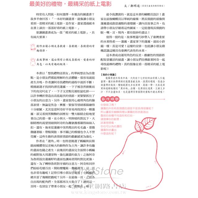 值得一提的是,故事裡還巧妙帶入了臺灣重要的水果特產--蓮霧。畫家筆下的蓮霧,就如小鈴鐺一樣,真是可愛!這樣的安排,也能讓小朋友藉機認識這種具有臺灣代表性的水果。