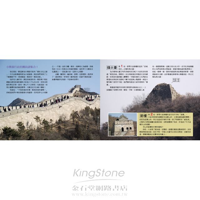 書末還為小讀者介紹建於萬里長城上的烽火臺、箭樓、城樓、垛口和角臺的建築設計與用途喔!
