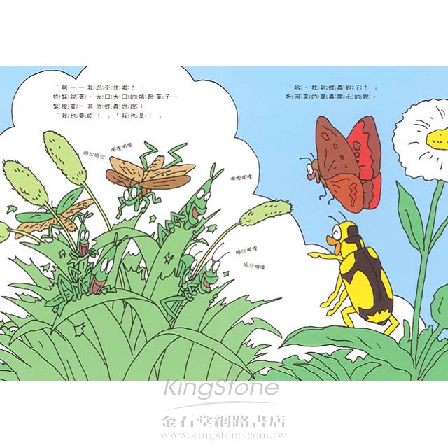 其他三組都張開大大的翅膀(代表布),只有臭蟲用屁股對著大家(代表石頭),因此甲蟲輸了…後來當我看到昆蟲百科後,才恍然大悟作者的用心。原來昆蟲綱底下又分許多目,其中代表有蜻蜓(蜻蛉目)、蝴蝶(鱗翅目)、蝗蟲(直翅目)和甲蟲(鞘翅目),而前三者在遭遇危險時,都可張開翅膀快速飛走,只有甲蟲因翅膀已退化隱藏在甲殼下,所以遇到危險時只能以噴出臭氣的方式來嚇退敵人(所以才會有臭蟲的稱號,如瓢蟲、椿象、天牛),在捉迷藏遊戲中,作者以分組的方式,不著痕跡將『分類』的觀念傳遞給讀者,實在高明!