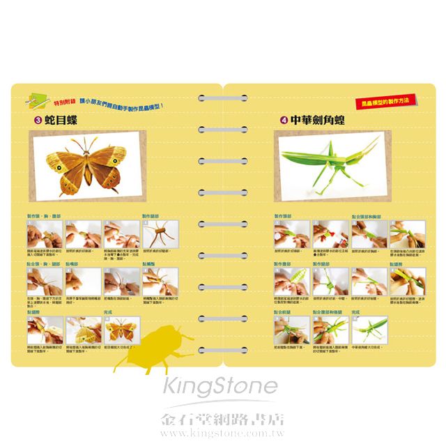 3.每冊提供4種昆蟲3D模型紙卡,只要利用膠水就能親手製作昆蟲模型。