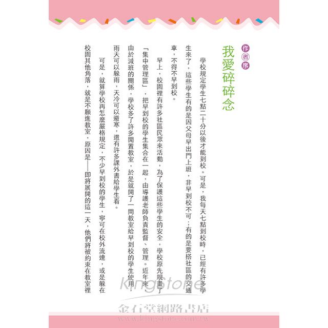 學校規定學生七點二十分以後才能到校。可是,我每天七點到校時,已經有許多學生來了,這些學生有的是因父母早出門上班,非早到校不可,有的是要搭社區的交通車,不得不早到校。