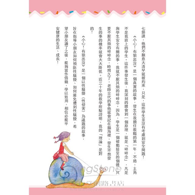 《小心!有狼出沒》是一個以性騷擾(性侵害)為議題的故事,旨在指導小朋友如何預防性騷擾、如何避免遭到性騷擾,希望小朋友讀了之後,能夠當做借鏡,學以致用,相信必能平安健康的生活、成長!