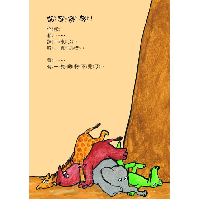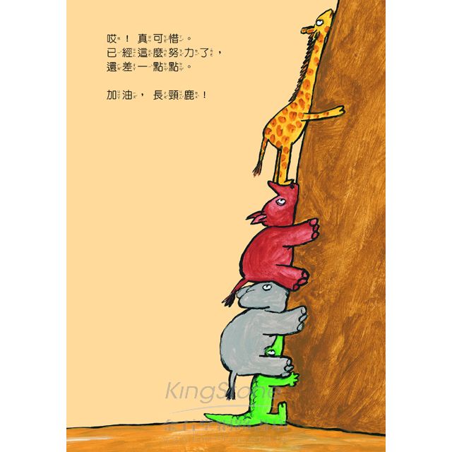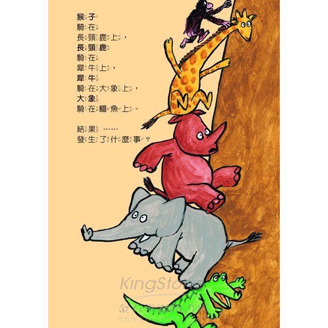 現在,猴子騎在長頸鹿的身上,長頸鹿騎在犀牛的身上,犀牛騎在大象的身上,大象騎在鱷魚的身上,哇~越來越高,越來越高,結果……發生什麼事呢?
