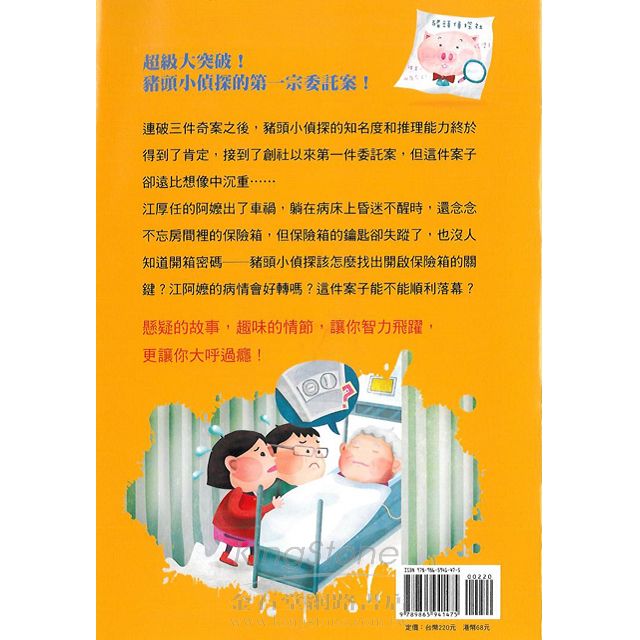 江厚任的阿嬤出了車禍,在病床上昏迷不醒時,還念念不忘房間裡的保險箱,但保險箱的鑰匙卻突然失蹤,也沒人知道開箱密碼,──豬頭小偵探該怎麼找出開啟保險箱的關鍵?江阿嬤的病情會不會好轉?這件案子能不能順利落幕?