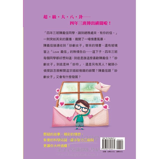 「四年三班陳義信同學,請到總務處來,有你的信。」一則突如其來的廣播,揭開了一場情書風暴。陳義信接連收到「妙齡女子」寄來的情書,還有玻璃窗上「Love 義信」的熱情告白……這下子,四年三班每個同學都好想知道:到底是誰這麼喜歡陳義信?「妙齡女子」到底是林「妙玲」,還是另有其人?