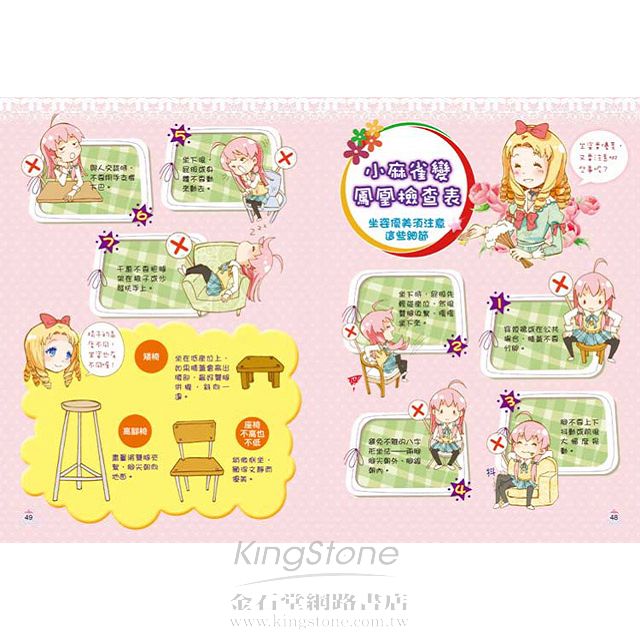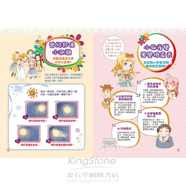(2)本書以活潑的漫畫形式,讓小讀者認識日常生活中必備的禮儀常識,以及超實用的基本美姿美儀技巧,讓小朋友透過簡單的訓練,輕鬆變身無比優雅的禮儀王子和社交公主。