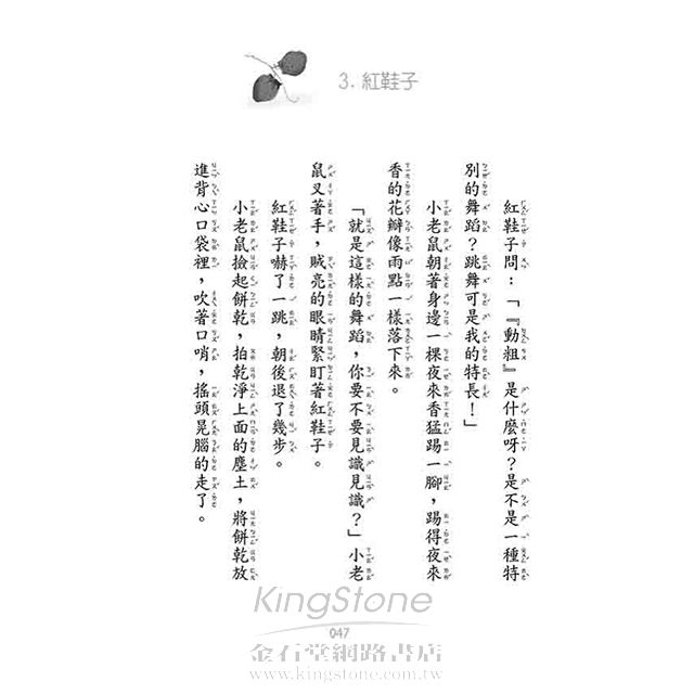 草地上的紅鞋子紅鞋子在草地上發愁。鞋子們發起愁來,總是一動不動的,看上去有點傻頭傻腦,跟草地上的石頭呀、落在樹下被蟲子們啃剩的果核,沒什麼兩樣。鞋子是要成雙成對的。一隻鞋子有什麼用呢?儘管它的顏色還那麼鮮豔,鞋幫上還用絲線繡了一艘小帆船,也沒有人肯要它了。難怪紅鞋子要發愁。一隻小老鼠最先在草地上發現了紅鞋子。小老鼠平時看慣了在草地上走來走去的鞋子,牠就以為這隻鞋子也會走動。牠耐心的待在鞋子旁邊,等待著鞋子走開,好讓牠去取壓在鞋跟下面的半塊餅乾。誰知道,從早上等到晚上,這隻鞋子還是一動也不動。小老鼠不耐煩了,牠氣呼呼的說:「你打算什麼時候走呀?你再不走,我可就要動粗了!」這隻鞋子原來的主人,是一個文雅的小姑娘,因此,這隻鞋子也像牠的主人那樣文雅,從來不知道「動粗」是什麼意思。紅鞋子問:「動粗是什麼呀?是不是一種特別的舞蹈?跳舞可是我的特長!」小老鼠朝著身邊一棵夜來香猛踢一腳,踢得夜來香的花瓣像雨點一樣落下來。「就是這樣的舞蹈,你要不要見識見識?」小老鼠叉著手,賊亮的眼睛緊盯著紅鞋子。紅鞋子嚇了一跳,朝後退了幾步。小老鼠撿起餅乾,拍乾淨上面的塵土,將餅乾放進背心口袋裡,吹著口哨,搖頭晃腦的走了。怕孤獨的紅鞋子「喂,你去哪兒?能帶著我嗎?」紅鞋子問。「帶著你?我為什麼要帶著你?」小老鼠問。「對不起,我不知道你為什麼要帶著我。」紅鞋子說,「我只知道,我不想獨自待在草地上,我以前從來沒有單獨一個人待過。」「我可是一個人待慣了。」小老鼠說,「我要回家去了。你不回家嗎?」「在這兒我沒有家,我的家在遠處,我是一隻被人遺失的紅鞋子。」小老鼠站在那兒,小爪子伸進背心口袋裡,抓緊那半塊餅乾。「夜裡沒有夥伴在一起,我會害怕的,你知道,我以前從來沒有單獨在外面過過夜。」紅鞋子說著說著,快要哭出聲了。「我可不知道,你有沒有單獨在外面過過夜,我對鞋子的事知道得不多。」小老鼠說,「我自己嘛,不管是在外面還是在家裡,從來都是單獨過夜的。只要不碰上貓,我看就沒什麼可怕的。」這時候,天已經黑下來了,月光照在草地上。紅鞋子說:「我不怕貓,我怕孤獨。」小老鼠不知道什麼是「孤獨」,牠問:「孤獨是什麼樣子?」紅鞋子想了想,回答說:「孤獨就是心裡空空的。」「心裡空空的?不對吧?你是不是想說『肚子裡空空的』?」小老鼠告訴紅鞋子,「那不叫『孤獨』,那叫『餓』。」「不,我從來都不知道什麼叫餓。」紅鞋子說。「那麼,你也不吃餅乾吧?」小老鼠試探的問。「我當然不吃餅乾!」紅鞋子說,「我什麼東西都不吃!不過,要是有鞋油的話,我倒是喜歡擦一點兒,鞋油是美容食品。」小老鼠大大的鬆了一口氣,牠說:「你想去我家,就跟著我吧。」