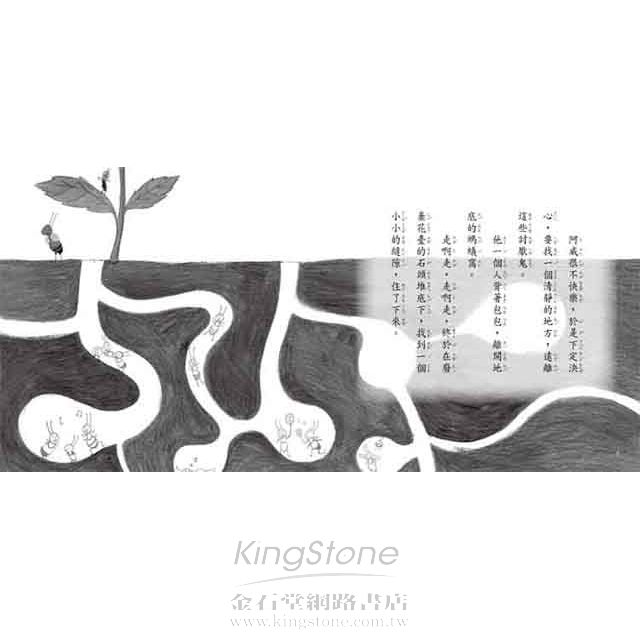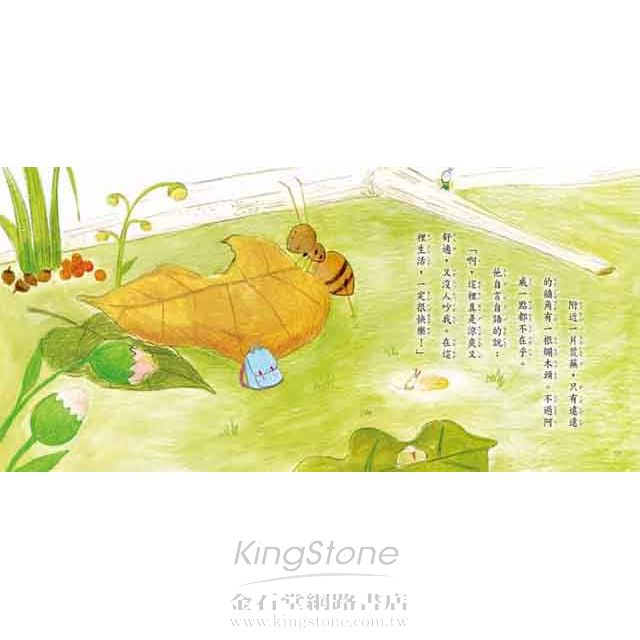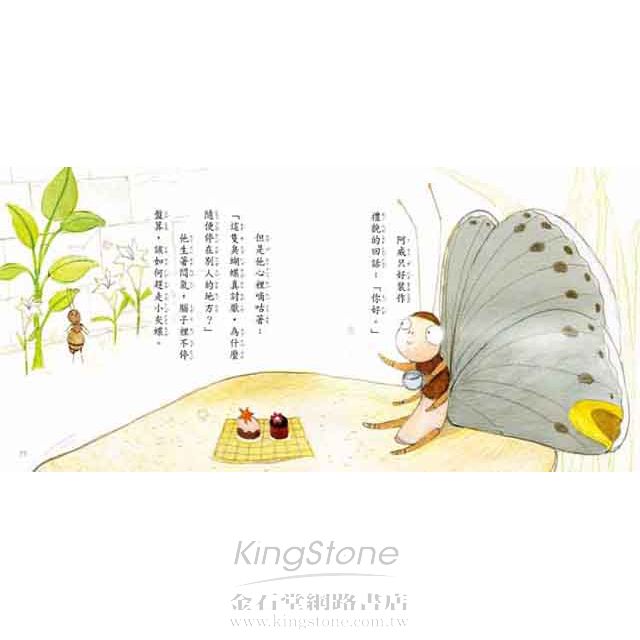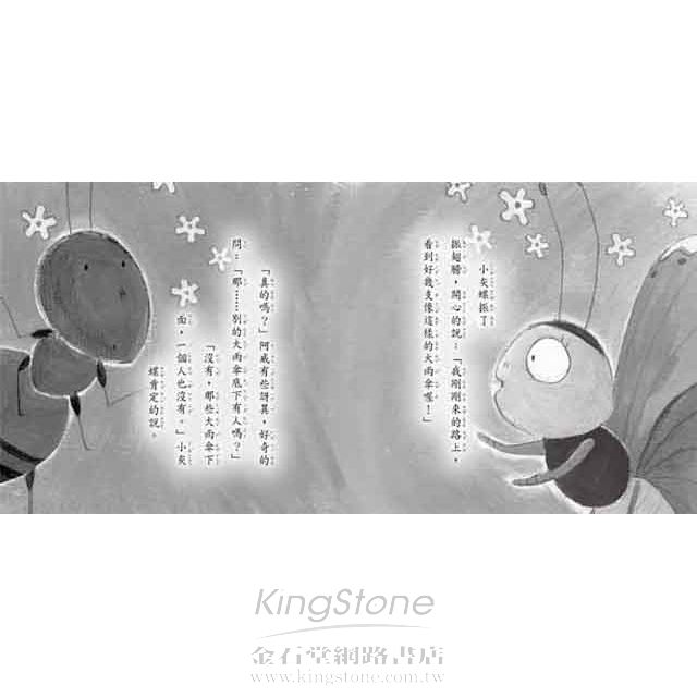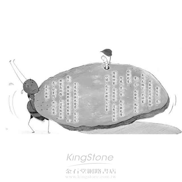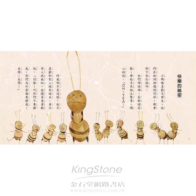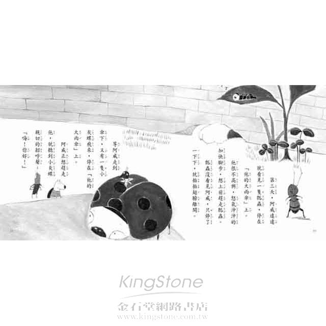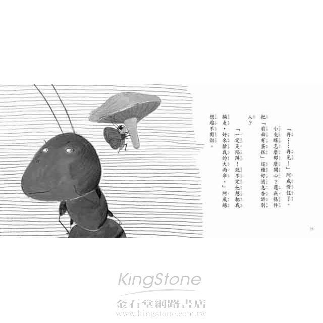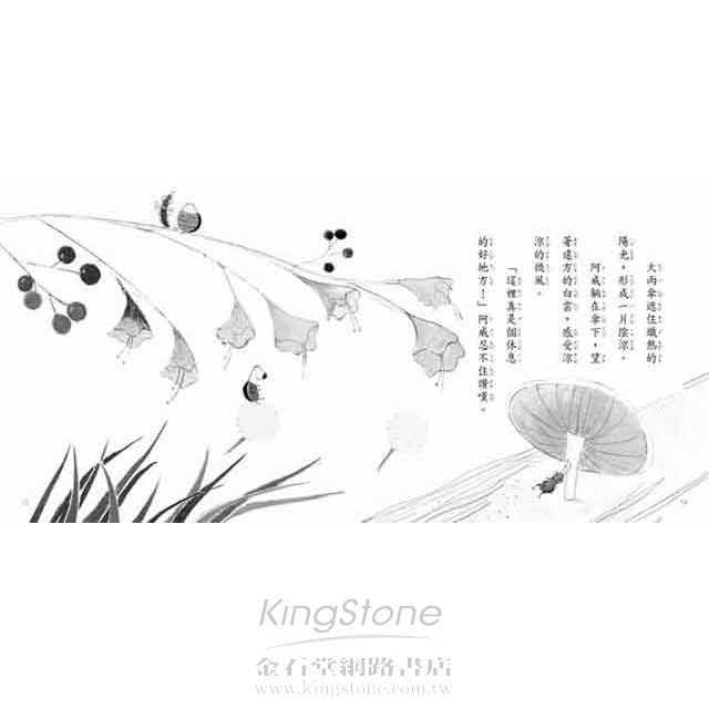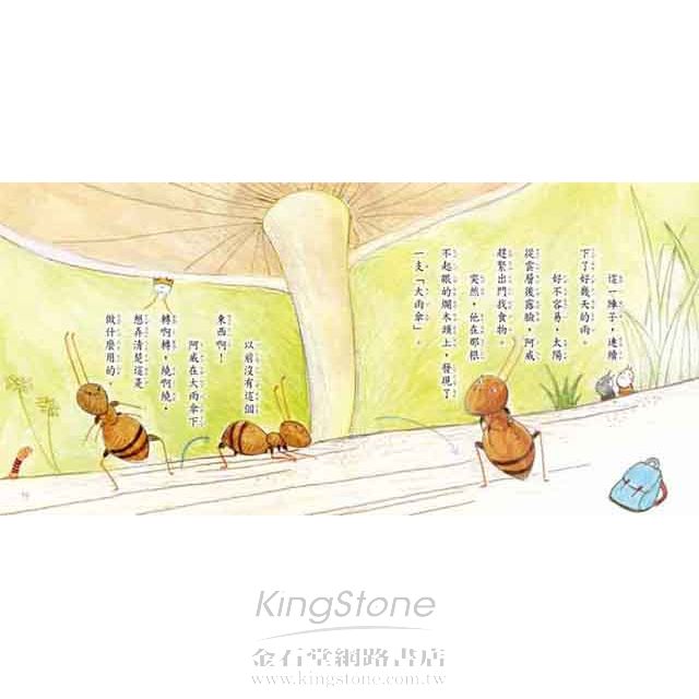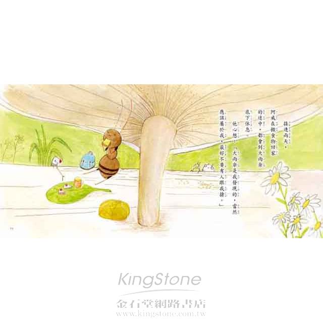 大家都知道,螞蟻是一種合群的動物,他們總是分工合作,有福同享,有難同當。可是阿威不喜歡這樣,他覺得什麼都要跟別人分來分去,擠來擠去,實在很不快樂,於是決定搬離螞蟻窩,找一個安靜的地方居住。他的新家附近有一把大傘,在外覓食很疲累時,他都會在那把傘下休息。想不到日子久了,竟然出現不速之客,「占領」阿威的大傘!阿威會怎麼做呢?他會把他們趕走嗎?快來看看這本書,希望你能和阿威一樣,體會與人分享的美好感受!