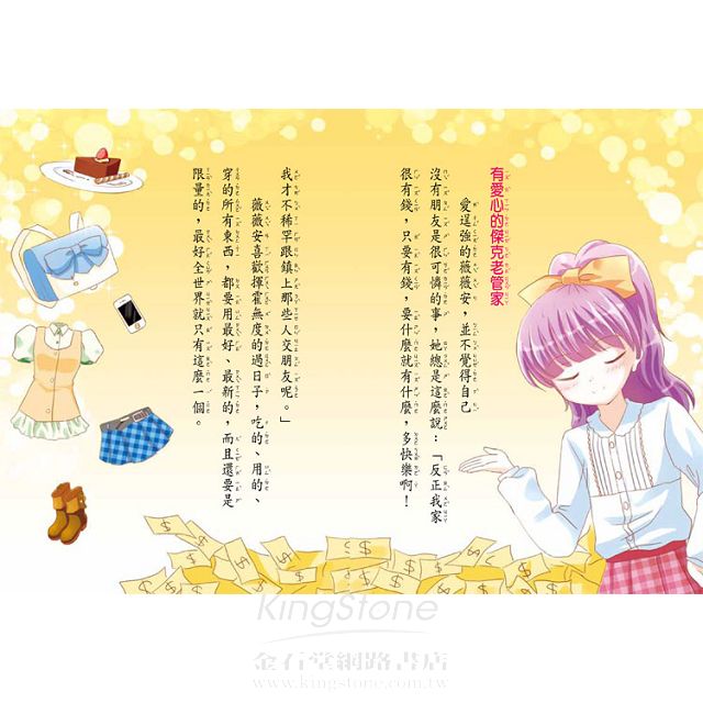 (7)讓小讀者體會不虛榮、不揮霍、不喜新厭舊的重要性,懂得珍惜有形的物資及無形的感情,就是最大的幸福。