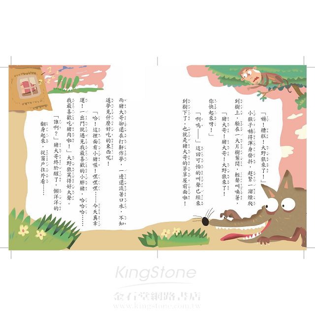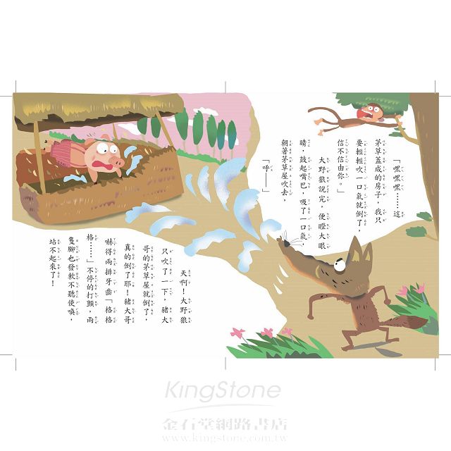 「豬大哥、豬二哥快逃啊!」大野狼要來吃小豬了;啄木鳥從樹上飛下來,又長又尖的嘴巴,用力啄著大野狼的大腦袋。