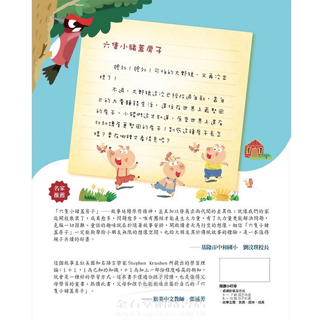 所以這本書不僅適合孩子閱讀,也是值得父母學習的童書;熟讀此書,父母和孩子也能創造出屬於自己的「六隻小豬蓋房子」。