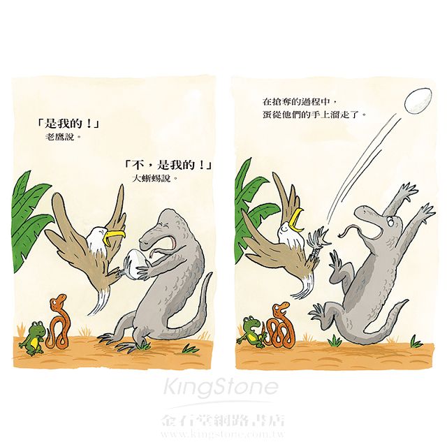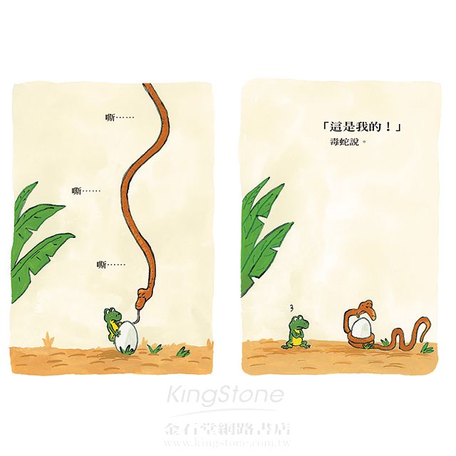 青蛙撿到一顆蛋,他開心地說:「這是我的!」沒想到蛇跟老鷹、大蜥蜴都跳出來說:「這是我的!」接下來會發生什麼事呢?到底蛋是誰的?