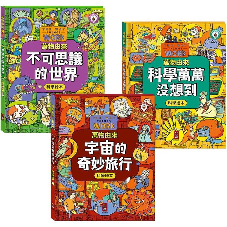 《萬物由來科學繪本》一套3冊,分別為「不可思議的世界」、「宇宙的奇妙旅行」、「科學萬萬沒想到」等,共有51個知識主題,包括天文、地理、科技、食物、能源、傳說等,提供孩子認識生活中萬事萬物的科學知識。