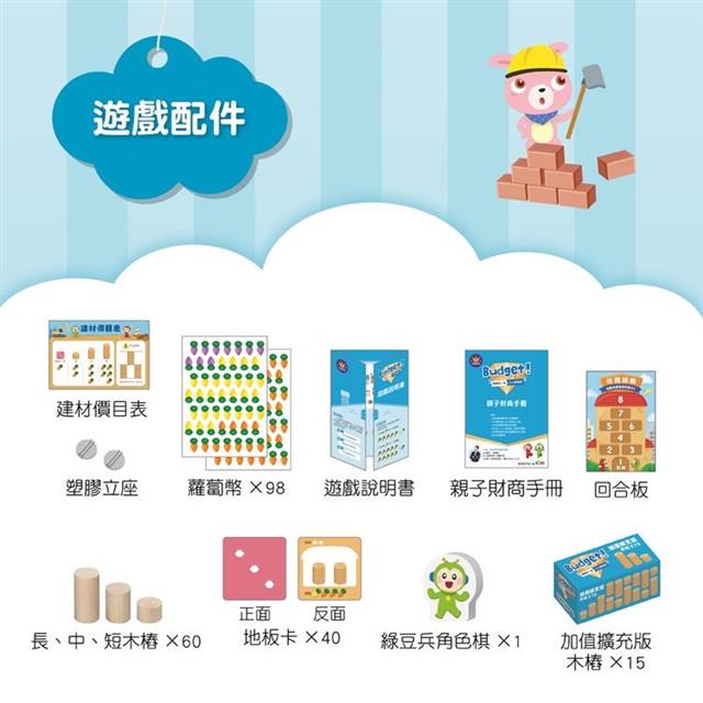 孩子有預算的概念和經驗後,就可以練習比較大金額的預算分配。玩法三就是一個很好的情境練習,在遊戲中孩子必須有更宏觀、更全面性的思考。預算的分配也會隨著情境的不同有所改變,到底抽到的是哪5 張的地板卡呢?如何分配卡片的樓層?如何在預算內買木柱才能讓房子蓋得最高?或許一開始對孩子們有些困難,但是隨著一次次的練習,您會發現孩子越來越厲害唷!