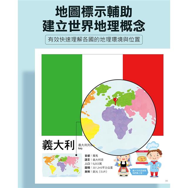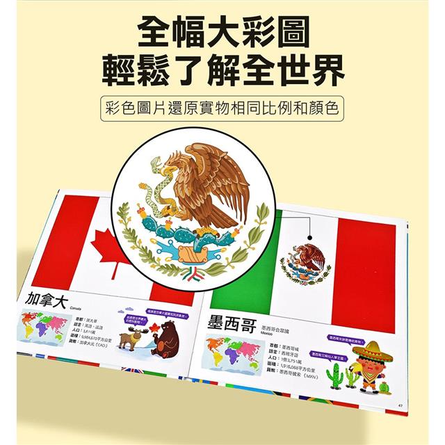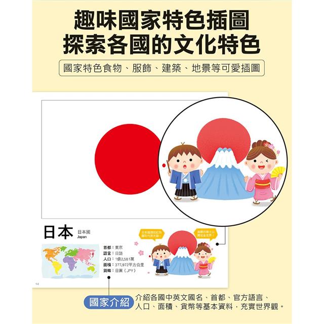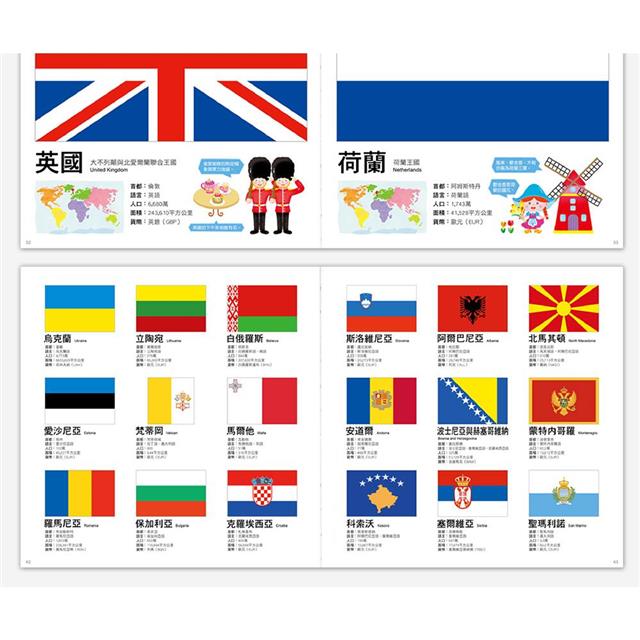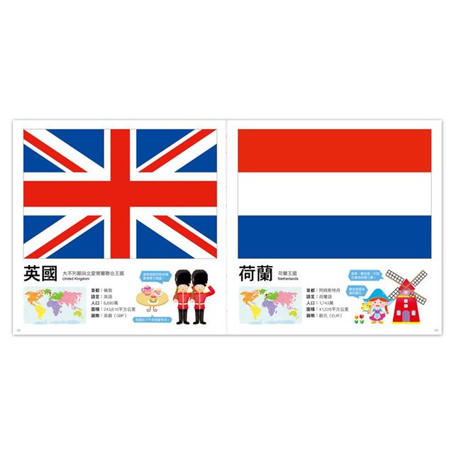 世界上各國的國旗象徵著國家的歷史與文化,本書介紹多個國家的國旗與由來、地理位置,以及首都、語言、人口、面積、貨幣等資料,透過本書能讓小朋友們認識全世界,拓展孩子的世界觀!