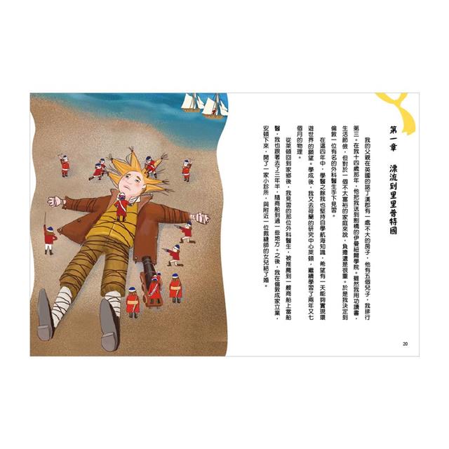 愛冒險的英國醫生格列佛,在他最愛的航海旅行途中遇上暴風,在汪洋大海中一次次偏離航道,最終漂流到兩個地圖上憑空冒出的國家:「小人國」和「大人國」。在這恍如異空間的奇特世界,展開一連串驚心動魄的故事,經歷一場場虛實交錯的人性試煉。在小人國裡,他是令人畏懼的「巨人」,砲彈打在身上也不痛不癢,卻遭到小人陷害!到了大人國,一下子變成了「小矮人」,不小心就會被巨人踩扁,還成了供人觀賞的玩物。令人哭笑不得、兩種截然相反的遭遇,格列佛究竟如何面對,以智慧克服難題,改變命運!揚起你冒險犯難之心的大帆,一起經歷這異國航海奇遇記!接受一場場考驗人性與智慧的試煉!