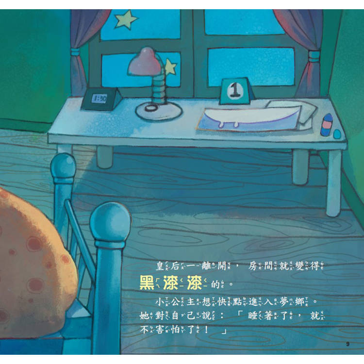 夜晚黑漆漆的房間裡,有好多好多可怕的怪物要來抓小公主,小公主害怕極了!可是仔細一看,這些怪物是真的嗎?小公主鼓起勇氣在房間裡四處尋找怪物的真面目,才發現原來黑暗並不可怕!