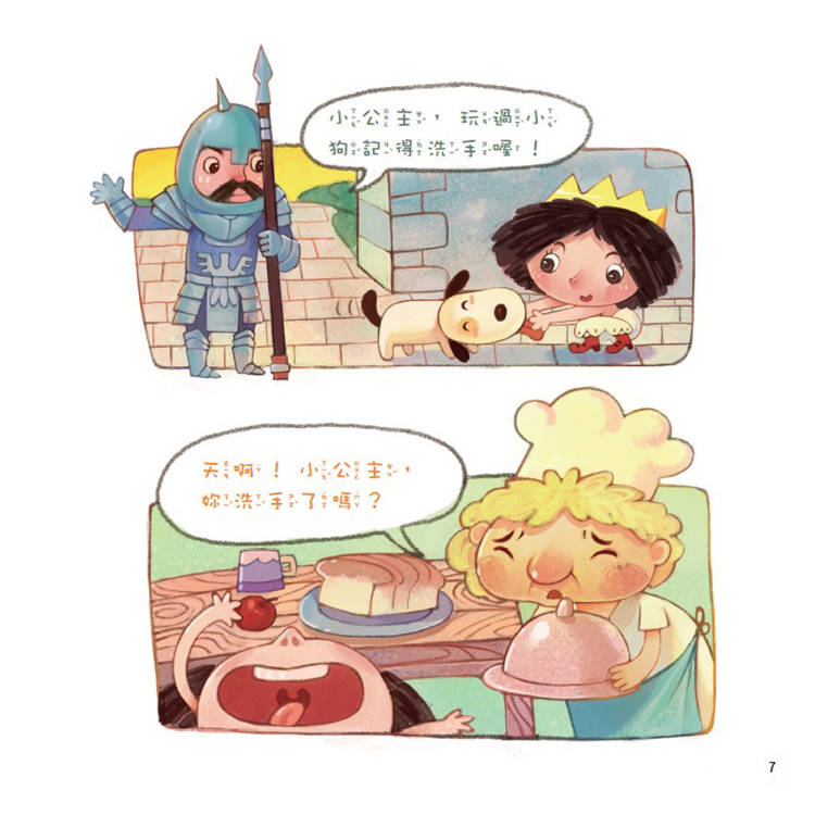 雖然大人們總是愛問小公主「洗手了沒?」,但小公主覺得自己的手一點也不髒,所以不願意乖乖洗手。直到有一天小公主的肚子變得好痛好痛,原來她摸過的盆栽、小狗、蠟筆上的細菌,全都跑進肚子裡搗蛋了!