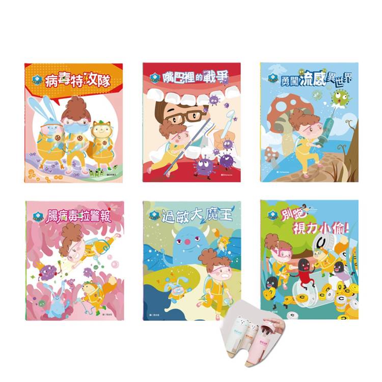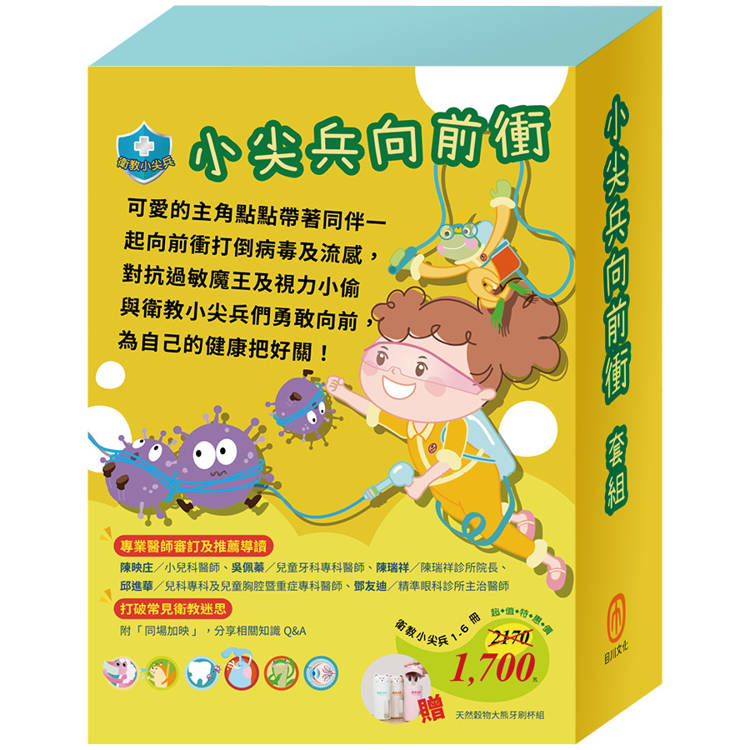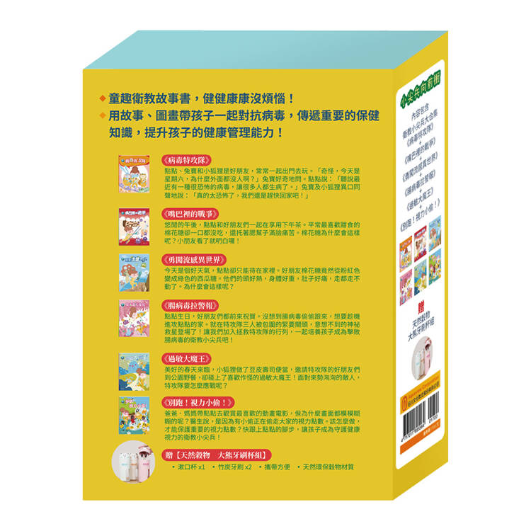 小尖兵向前衝 套組:《衛教小尖兵:病毒特攻隊+勇闖流感異世界+腸病毒拉警報+過敏大魔王+別跑!視力小偷!》加贈大熊牙刷杯組