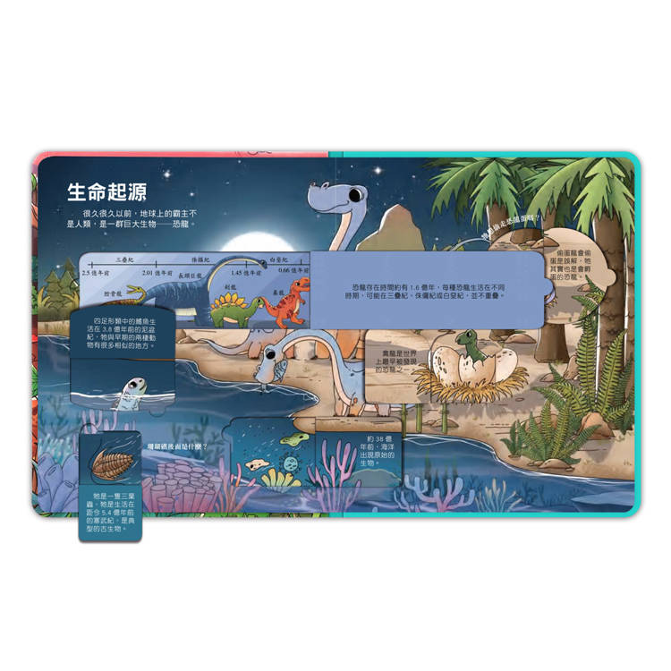 在陸地上的恐龍有哪些呢?又有哪些恐龍生活在海洋裡?不同時期的恐龍長得一樣嗎?快來探索神祕又有趣的恐龍吧!