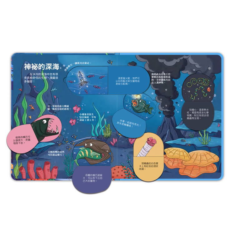 《百問百答圖解翻翻書-揭祕海洋》利用淺顯易懂的文字故事內容,配合翻翻頁的問答小知識,超過30種不同的翻翻機關頁面,只要翻開來就能立刻解答疑問,帶領孩子們探索世界,開啟奇妙的探索科普之旅!